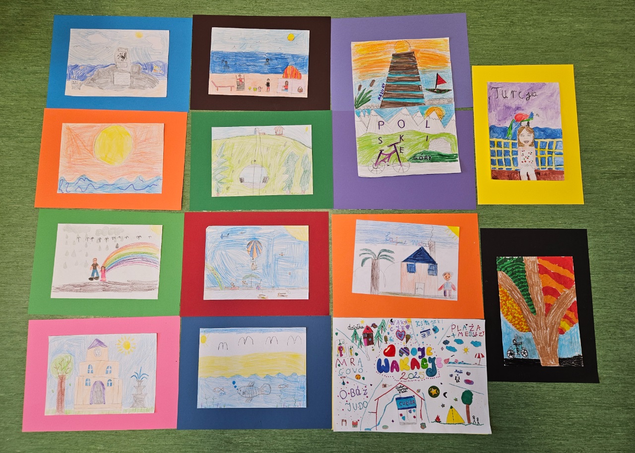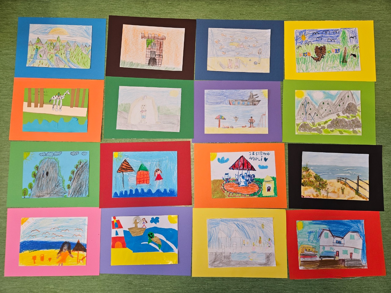 We wrześniu w naszej szkole odbył się konkurs plastyczny dla klas I–III pod hasłem „Kartka z wakacji”. Uczniowie wykazali się ogromną kreatywnością i pomysłowością, przedstawiając swoje wspomnienia z wakacyjnych przygód w formie barwnych prac plastycznych.