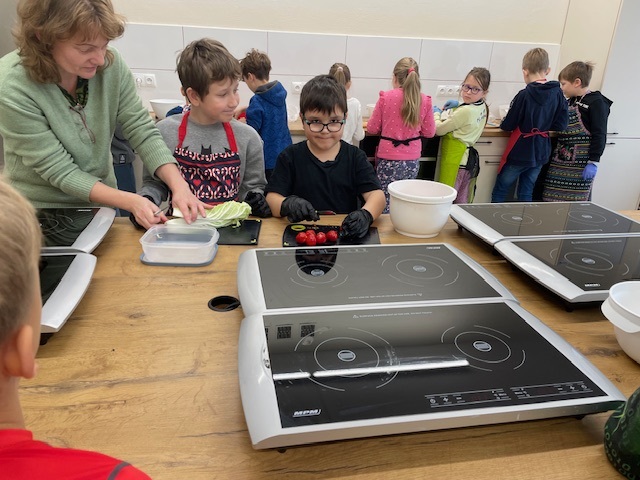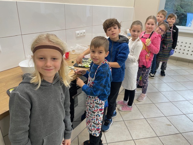 W ramach innowacji pedagogicznej „Radość czytania i gotowania" uczniowie klasy 2c tym razem wysłuchali opowiadanie "Dzień Babci i Dziadka. Mniam, mniam". Na podstawie wysłuchanego tekstu rozmawialiśmy o zdrowym odżywianiu oraz zasadach higieny podczas przygotowywania posiłków, o empatii do innych. Uczniowie pogłębili również wiedzę na temat warzyw jako produktów bogatych w witaminy i poznali znaczenie ich regularnego spożywania.