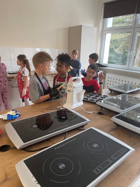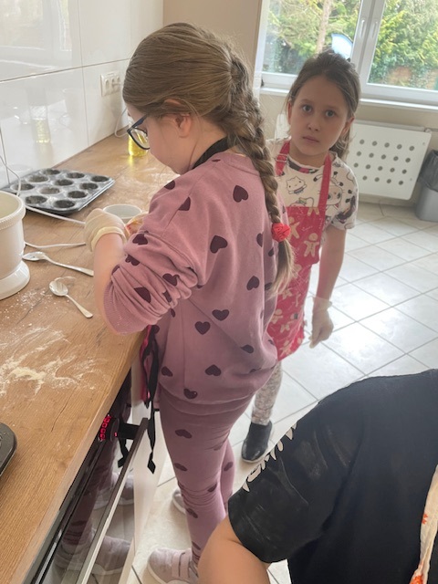 Potem zaczęła się najprzyjemniejsza część – gotowanie! Z wielkim zaangażowaniem przygotowaliśmy ciasto na muffinki. W sali kulinarnej pachniało wspaniale, a my świetnie się bawiliśmy.
