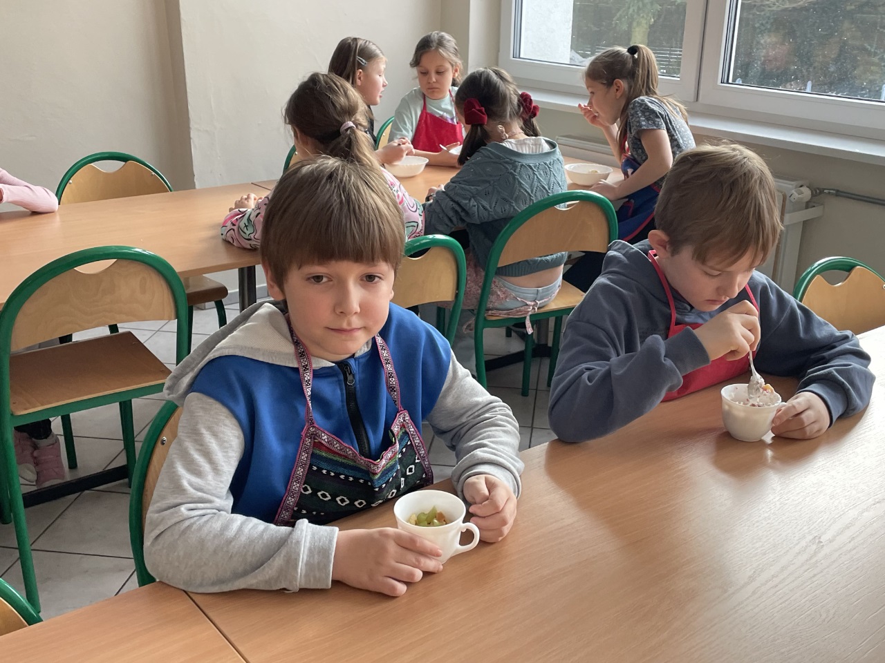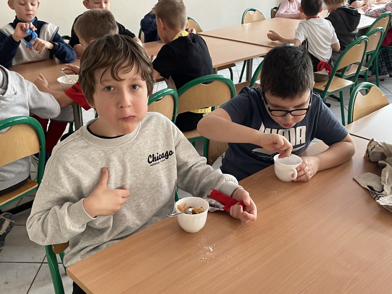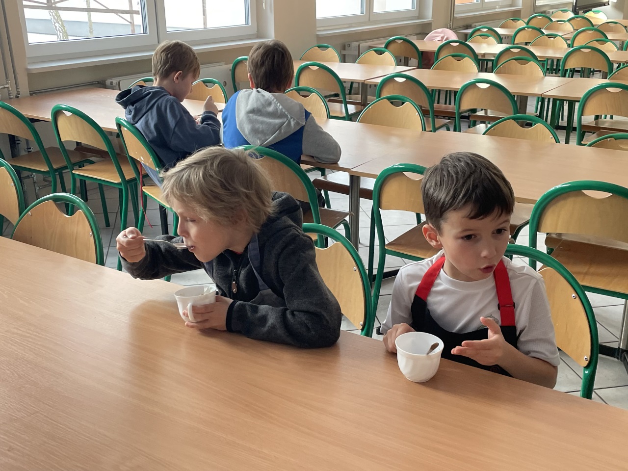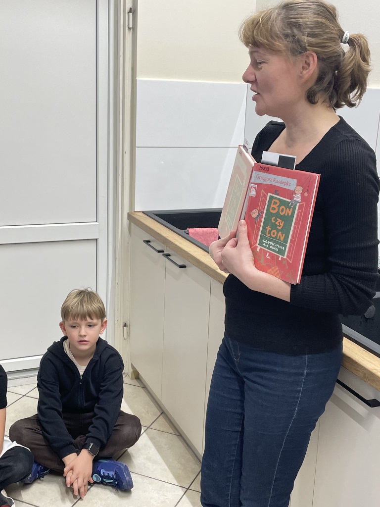 Dziś w ramach innowacji pedagogicznej „Radość czytania i gotowania” uczniowie klasy 2c wysłuchali fragmentu książki Grzegorza Kasdepke „Bon czy ton. Savoir-vivre dla dzieci” dotyczącego właściwego zachowania przy stole oraz zasad higieny podczas przygotowywania posiłków.