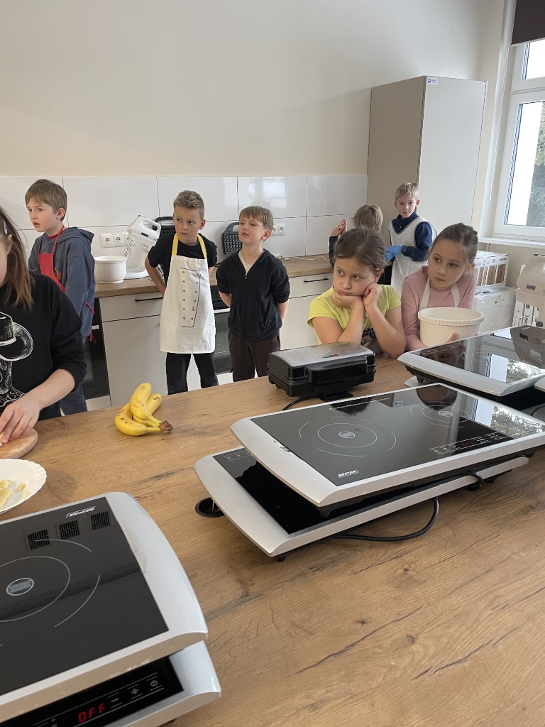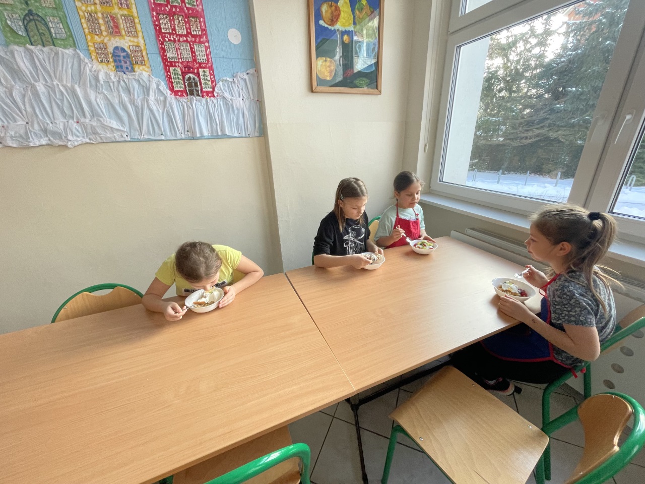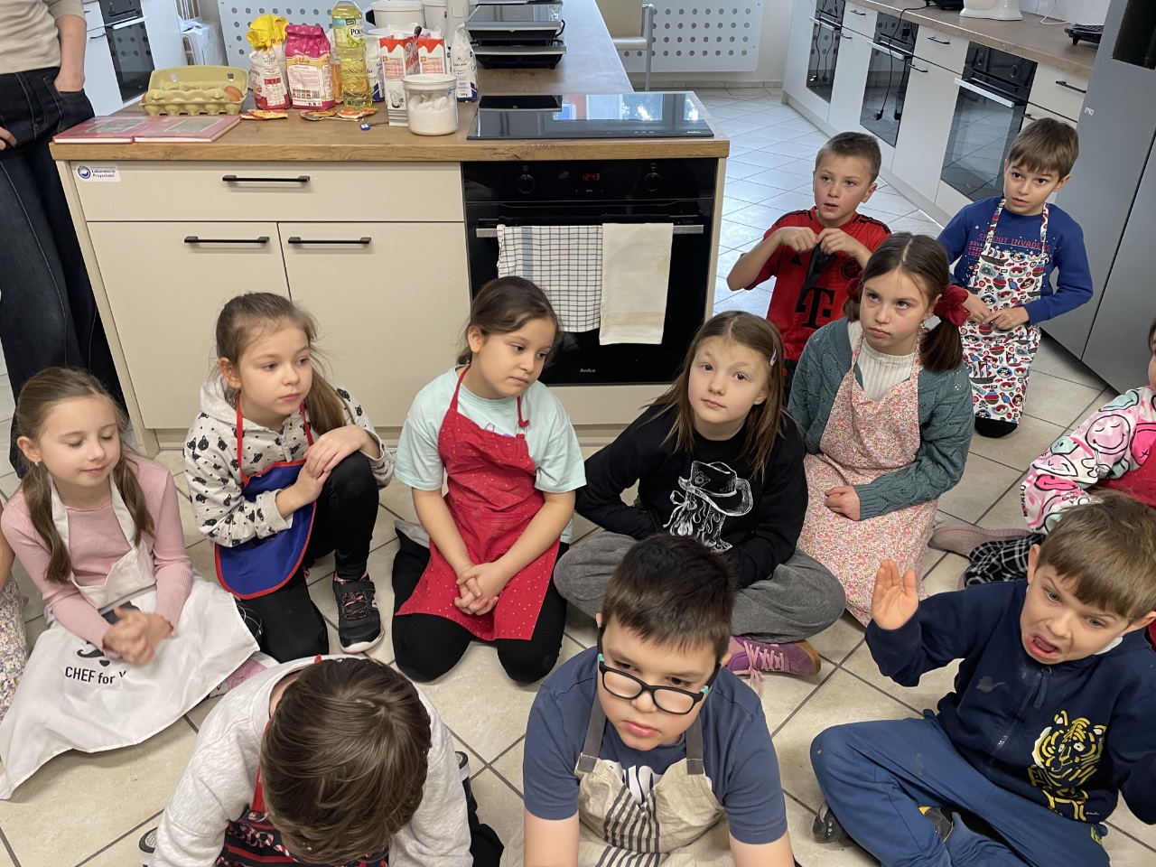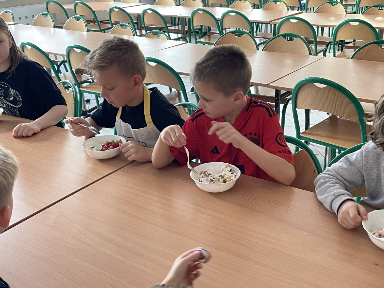 Dziś w ramach innowacji pedagogicznej „Radość czytania i gotowania” uczniowie klasy 2c wysłuchali fragmentu książki Grzegorza Kasdepke „Bon czy ton. Savoir-vivre dla dzieci” dotyczącego właściwego zachowania przy stole oraz zasad higieny podczas przygotowywania posiłków.