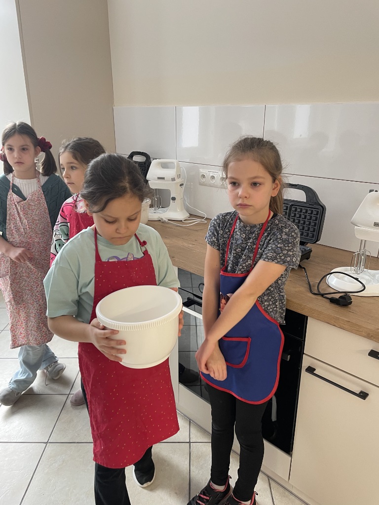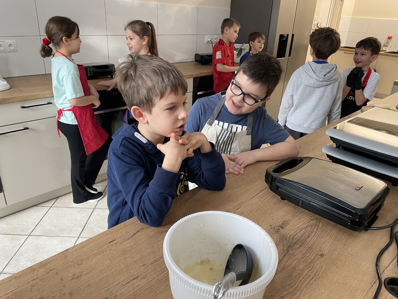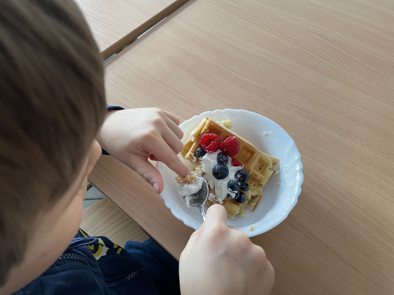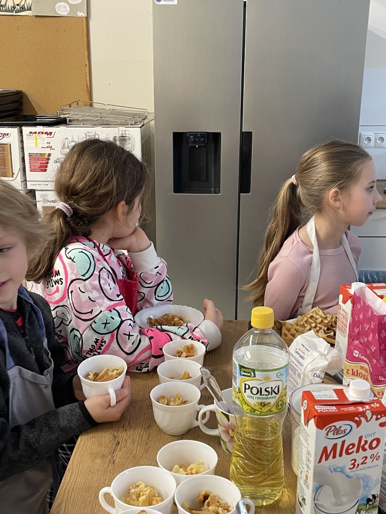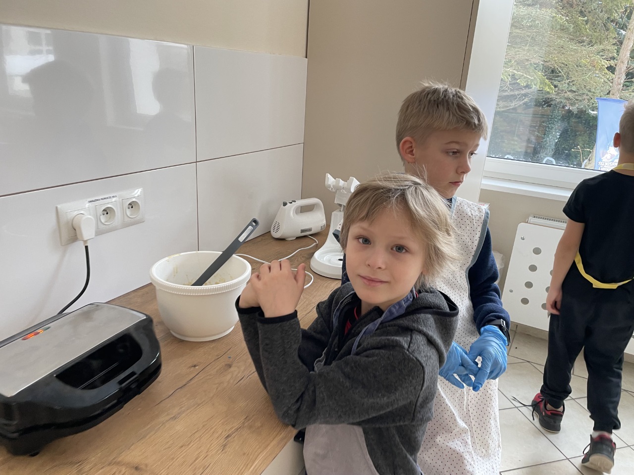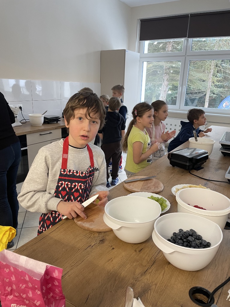 Następnie w dwuosobowych zespołach przygotowywali ciasto na gofry oraz dodatki – owoce i bitą śmietanę.