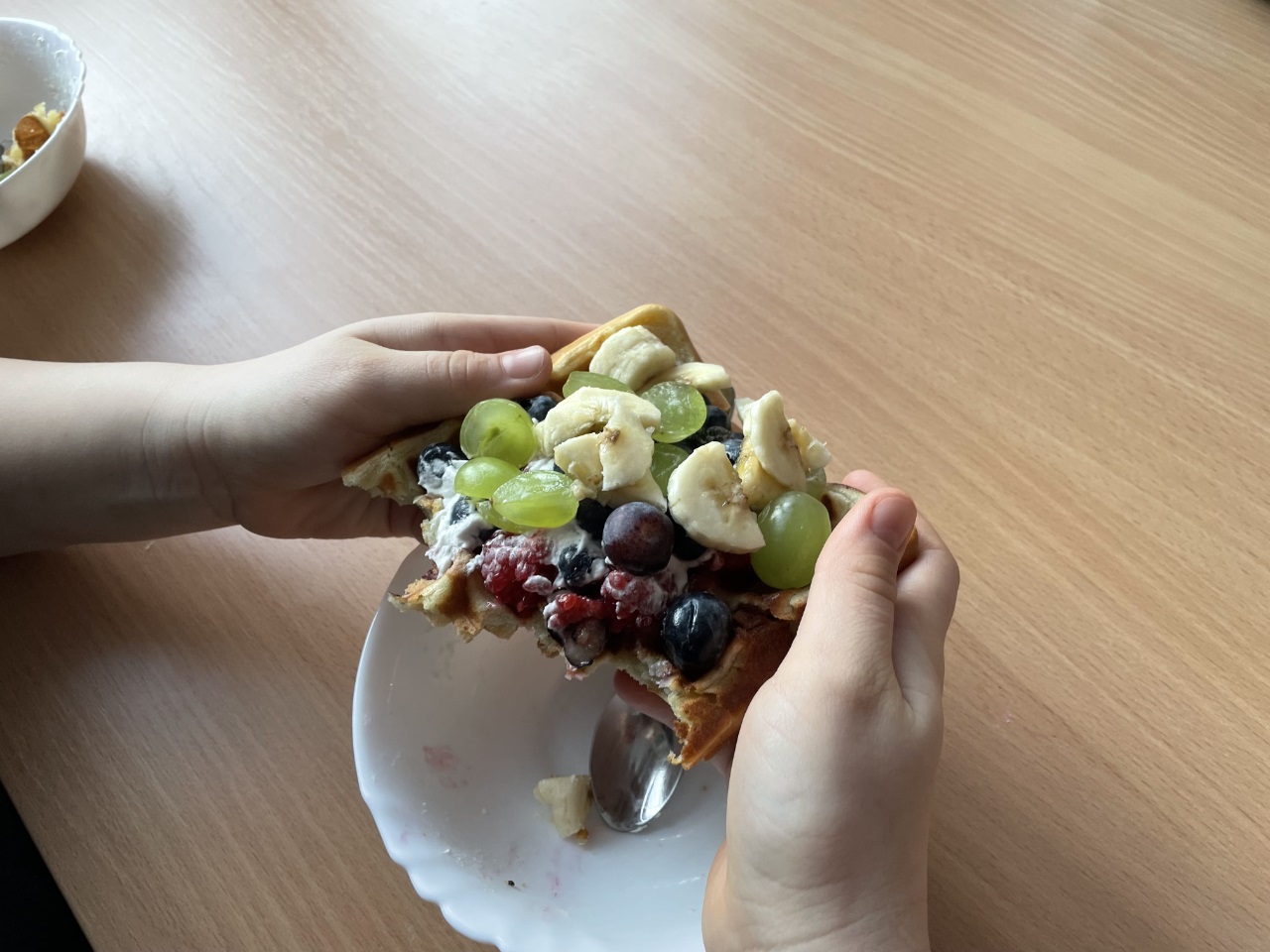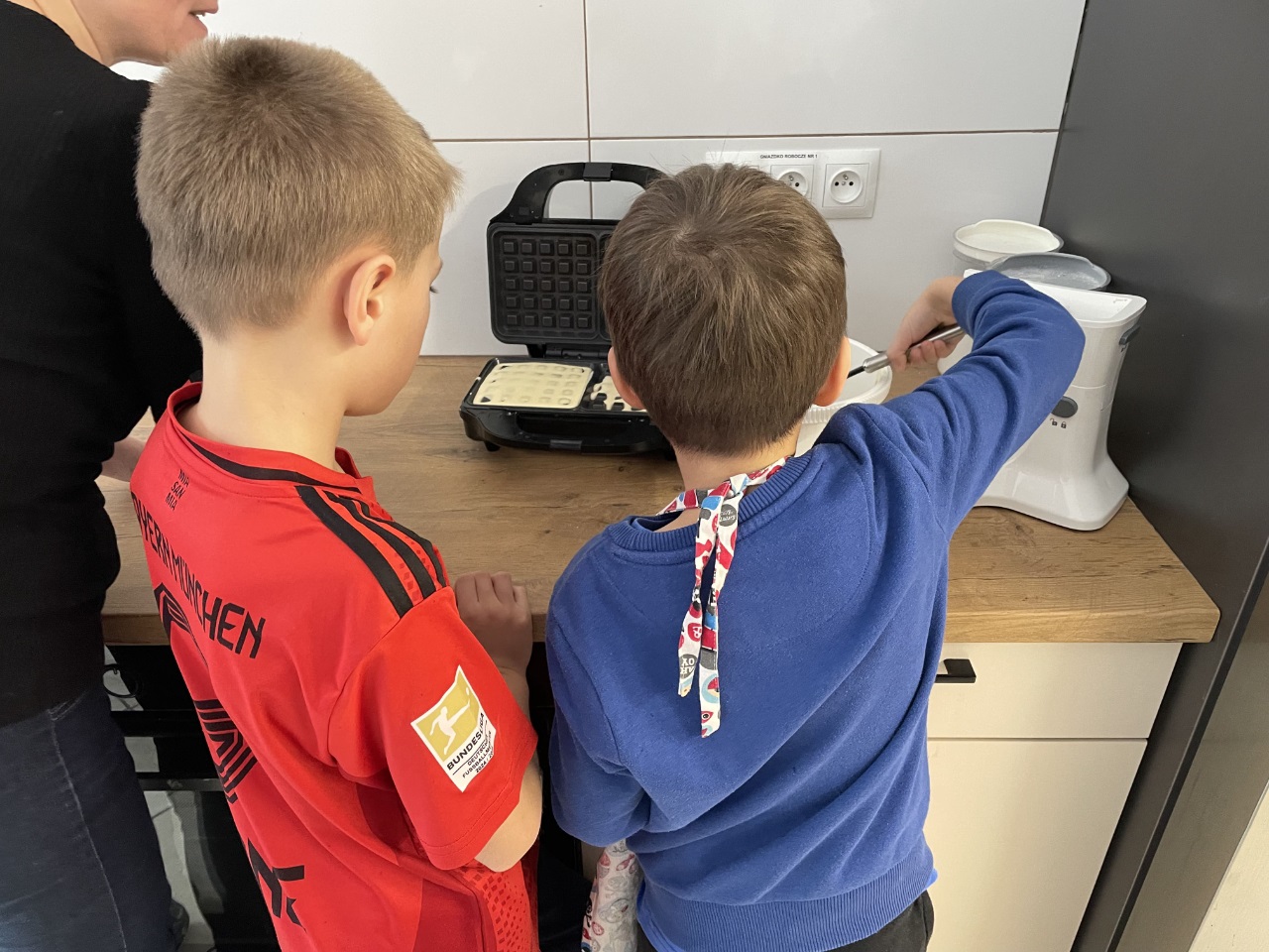 Gofrownica pracowała pełną parą… choć czasami miała własne zdanie. Niektóre gofry postanowiły zostać na zawsze w środku i odmówiły wyjścia, więc zrobiliśmy z nich deser gofrowy „w wersji deluxe” (czyli z pokruszonych kawałków – dla znawców!).