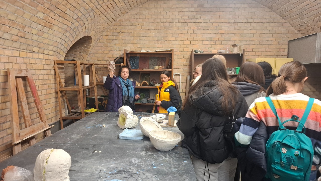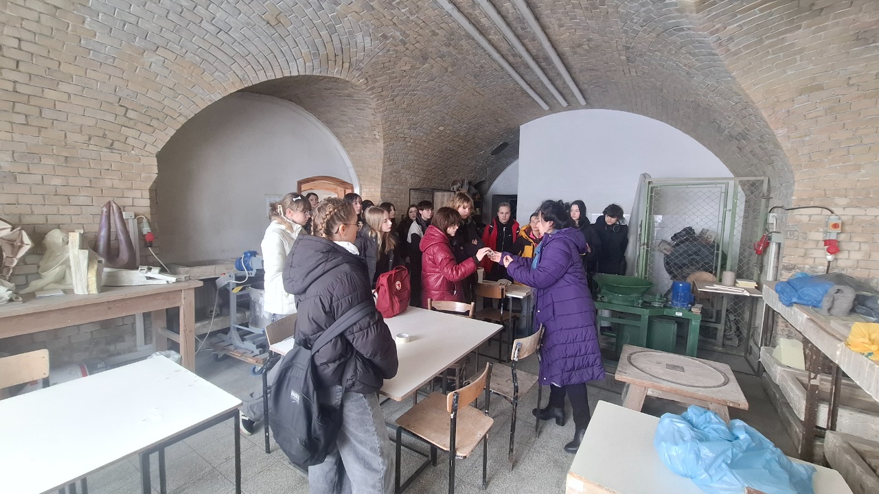 Po budynku Małej Zbrojowni, w którym znajdują się pracownie Wydziału, oprowadzała nas Pani prof. dr hab. Adriana Majdzińska. W niezwykle interesujący i inspirujący sposób zaprezentowała uczniom różnorodne pracownie artystyczne, m.in.: rzeźby, technik rzeźbiarskich, podstaw projektowania plastycznego, projektowania i organizacji przestrzeni, małych form rzeźbiarskich, ceramiki artystycznej, a także pracownie rysunku. Duże zainteresowanie wzbudziła również zaprezentowana technologia projektowania 3D, dzięki której – na podstawie wprowadzonych do programu danych – możliwe jest stworzenie własnego dzieła przy użyciu nowoczesnych narzędzi komputerowych.