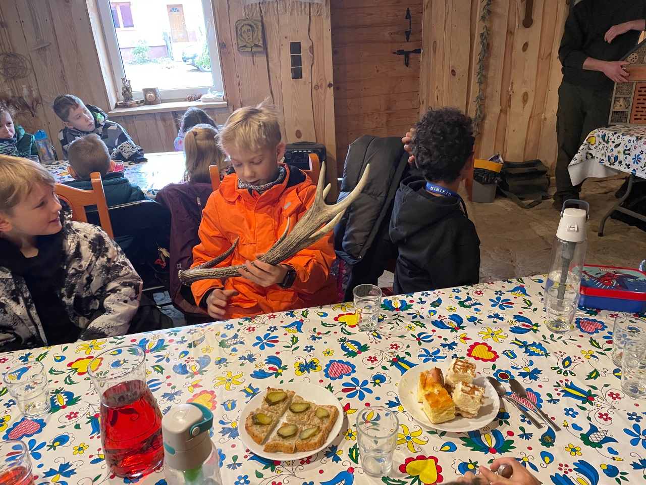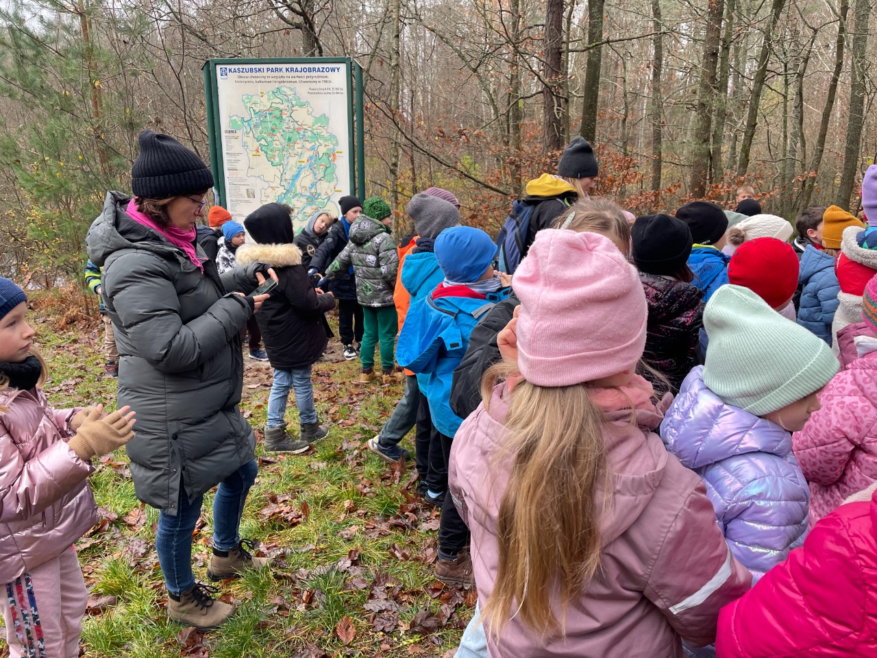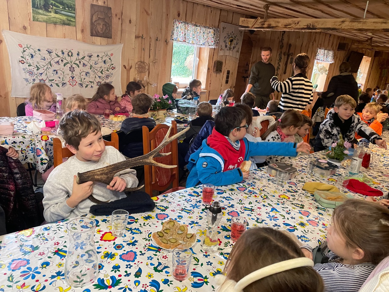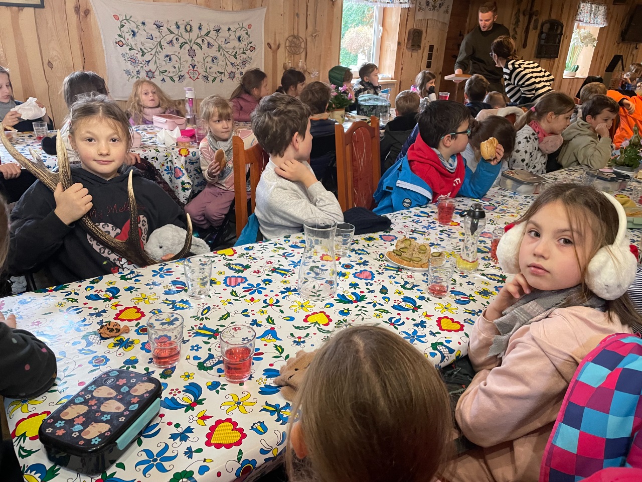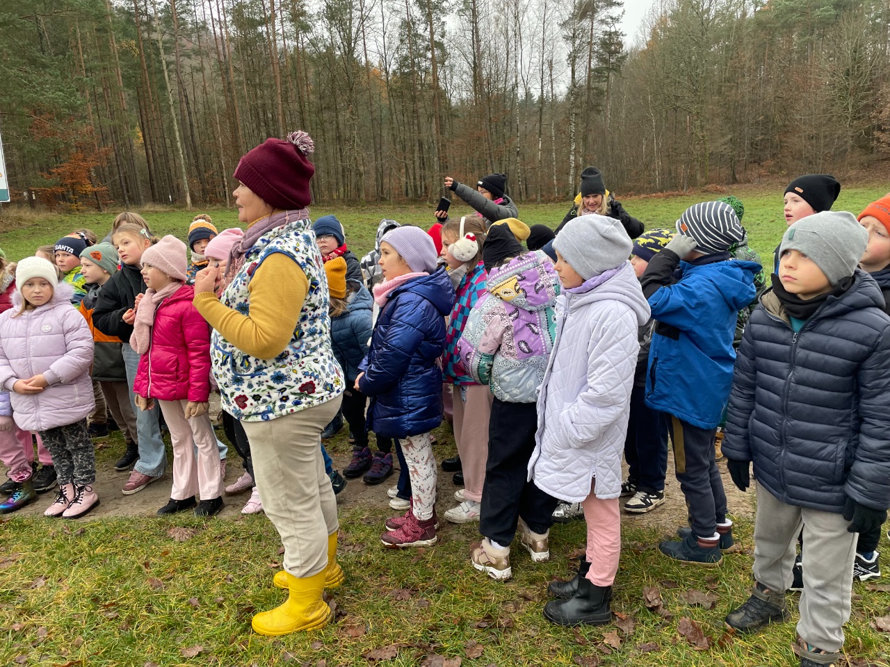 Po spacerze w lesie odbyło się spotkanie z panem leśnikiem, który opowiadał o zwierzętach i roślinach oraz o zasadach bezpiecznego zachowania w lesie. Nie zabrakło też słodkich i swojskich przysmaków – była wata cukrowa, pyszna pomidorowa zupka, domowa drożdżówka oraz swojski chleb ze smalcem - kaszubską nutellą.