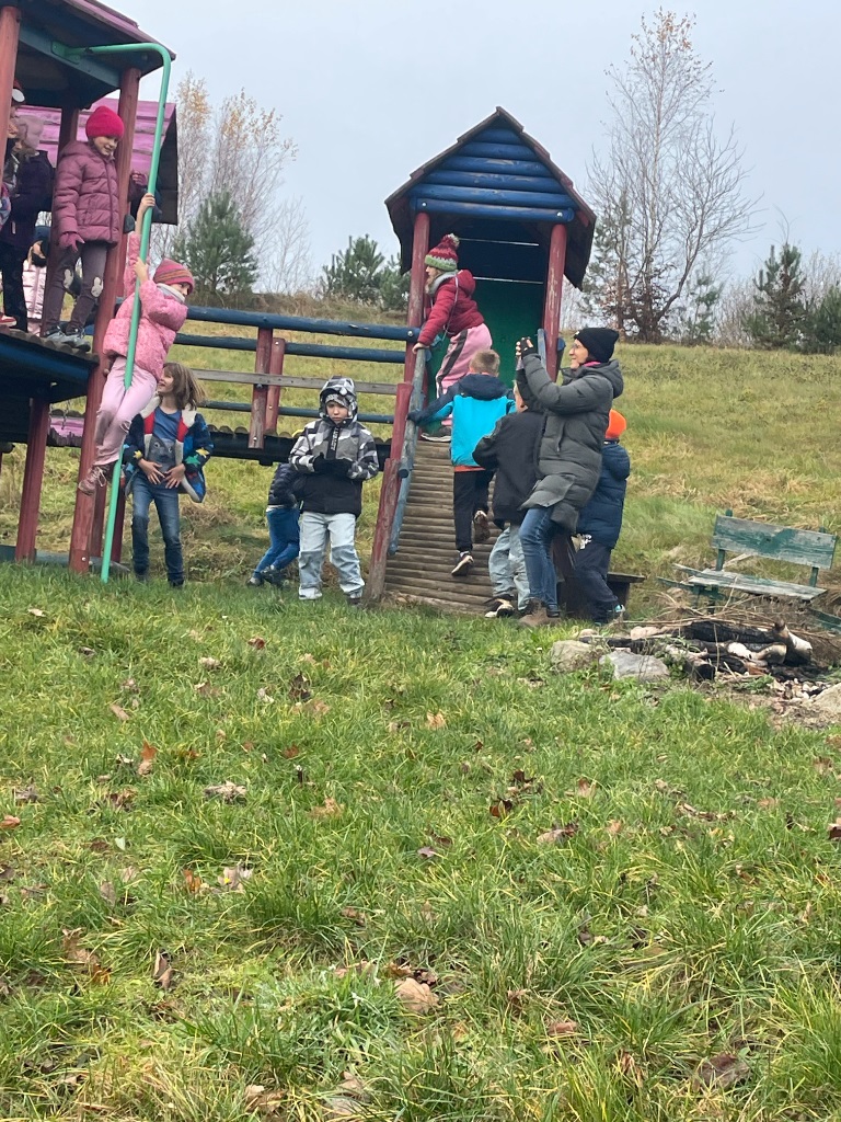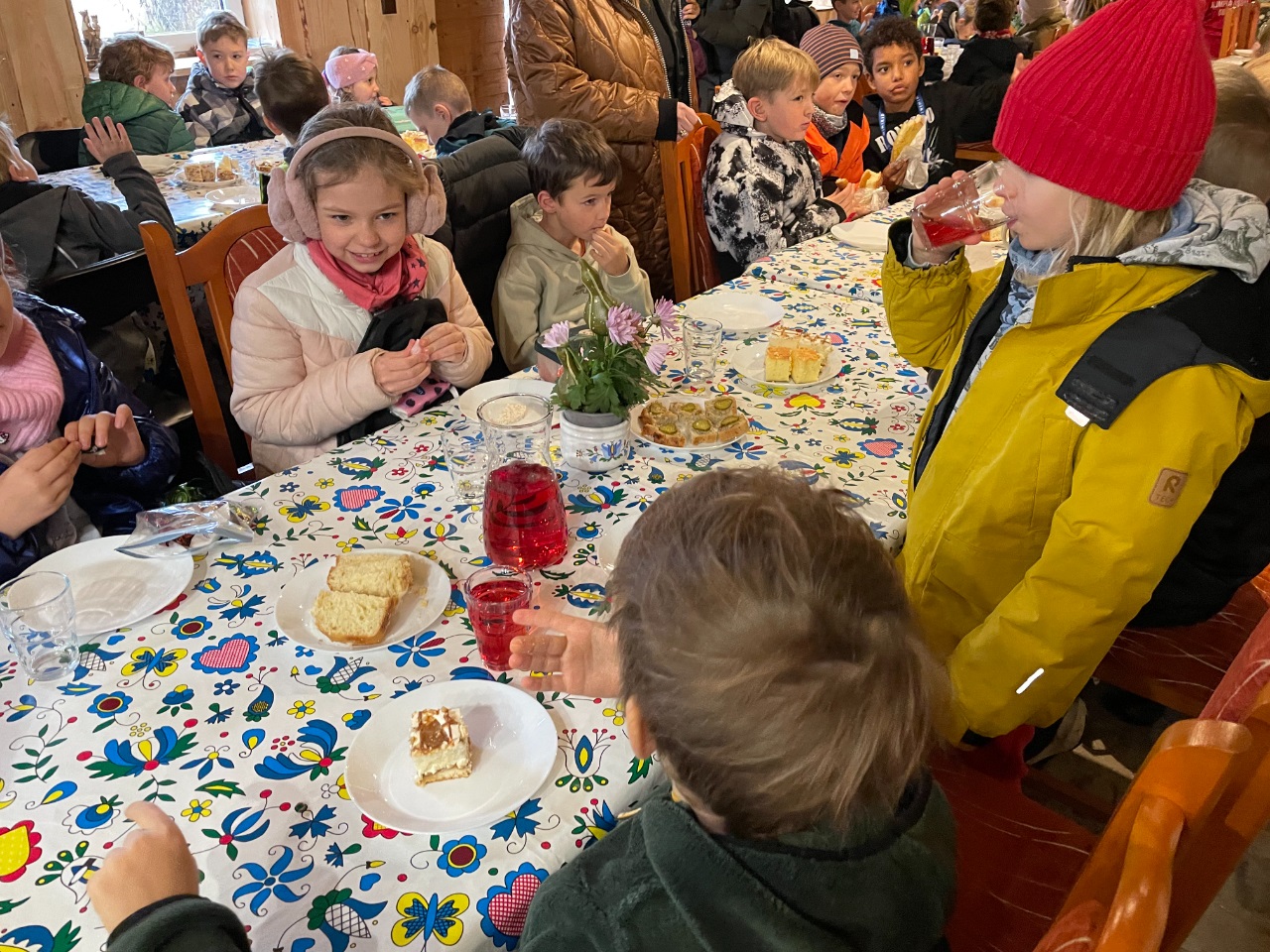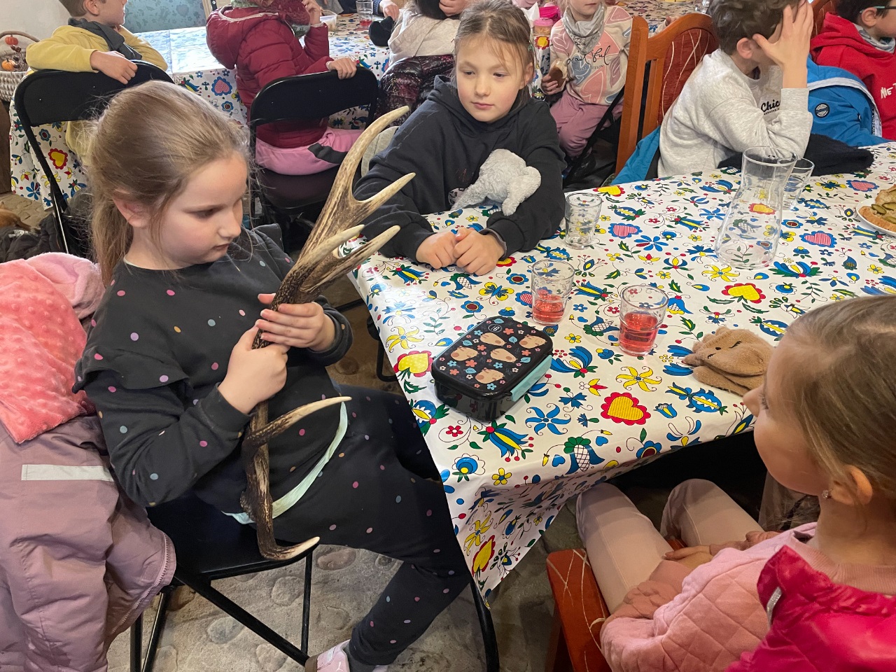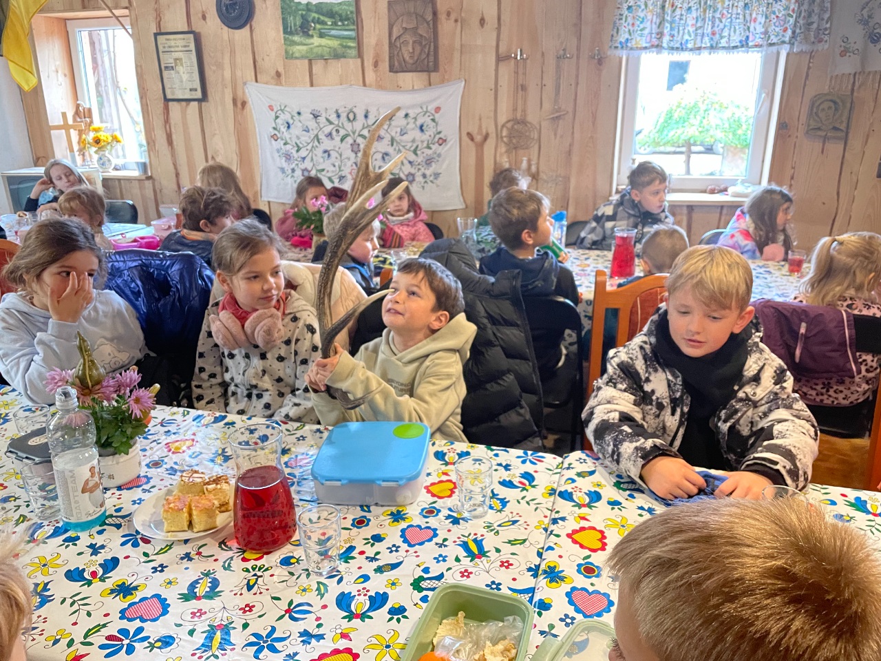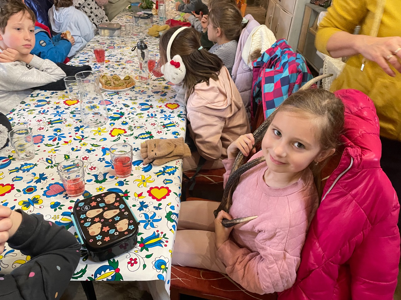 Po spacerze w lesie odbyło się spotkanie z panem leśnikiem, który opowiadał o zwierzętach i roślinach oraz o zasadach bezpiecznego zachowania w lesie. Nie zabrakło też słodkich i swojskich przysmaków – była wata cukrowa, pyszna pomidorowa zupka, domowa drożdżówka oraz swojski chleb ze smalcem - kaszubską nutellą.