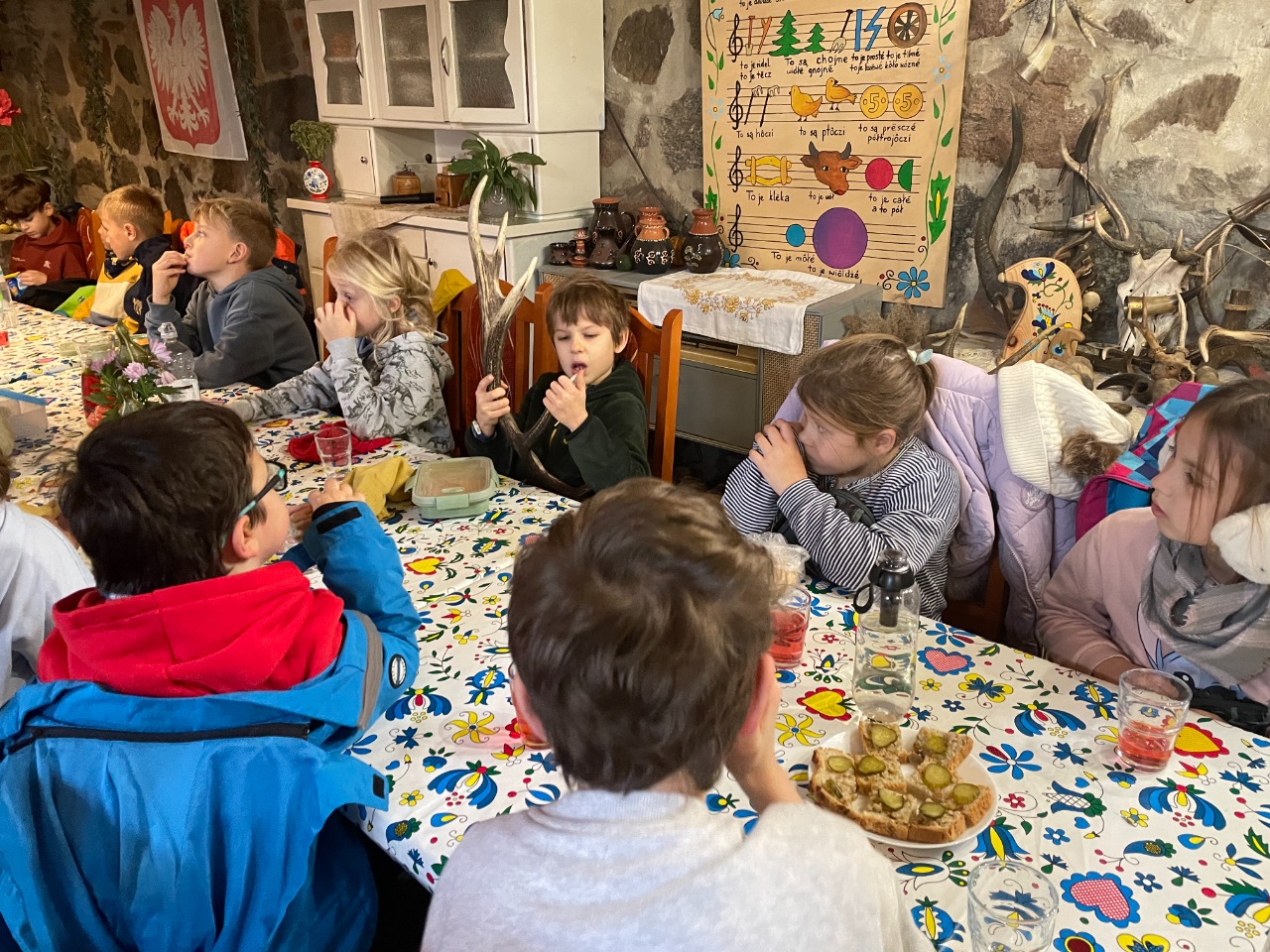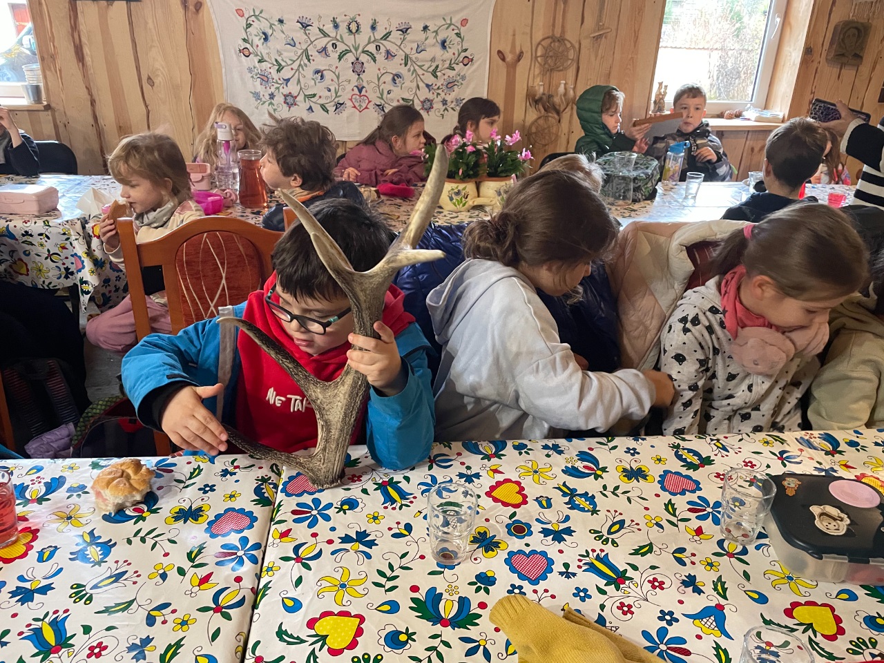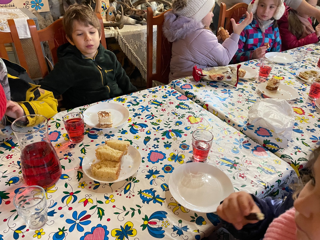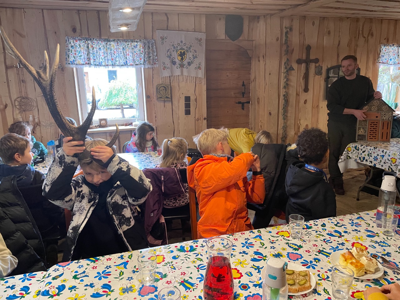 Po spacerze w lesie odbyło się spotkanie z panem leśnikiem, który opowiadał o zwierzętach i roślinach oraz o zasadach bezpiecznego zachowania w lesie. Nie zabrakło też słodkich i swojskich przysmaków – była wata cukrowa, pyszna pomidorowa zupka, domowa drożdżówka oraz swojski chleb ze smalcem - kaszubską nutellą.